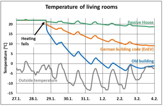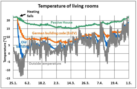 - У новому будинку, зведеному за національними стандартами Німеччини, температура знизилась до непридатного до проживання протягом двох днів. На сьомий день, температура всередині будинку знизилась до +9˚С;
